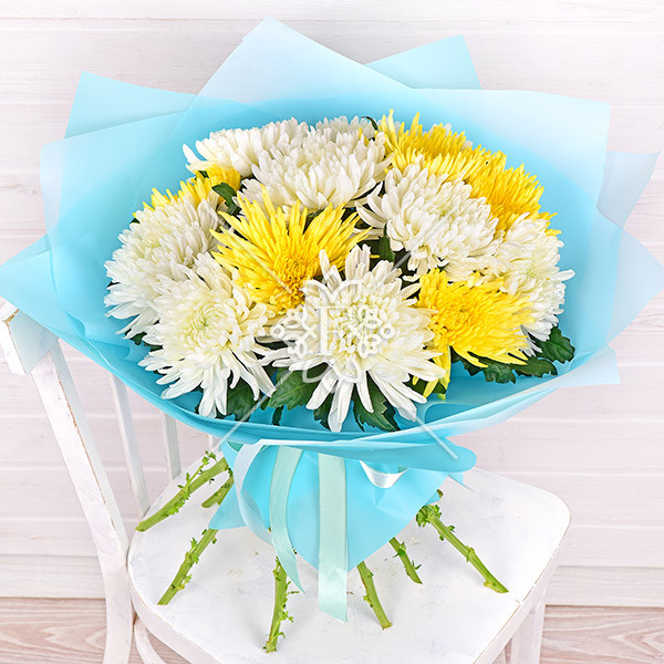 Несравненно-прекрасные, воздушные, словно облака белые хризантемы и хризантемы желтого цвета, напоминающие солнечные лучи, выглядят гармонично и изысканно.